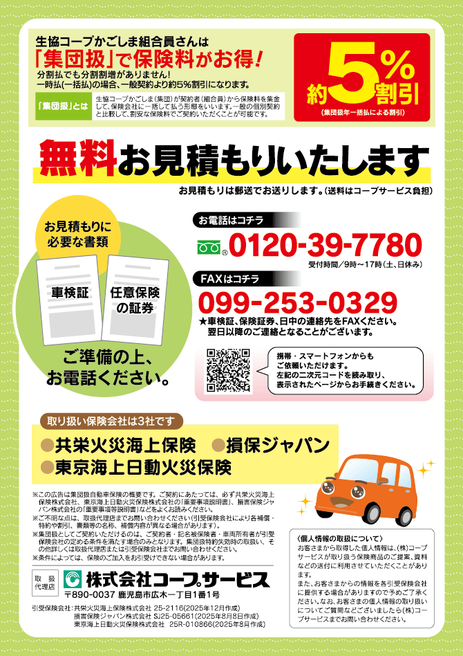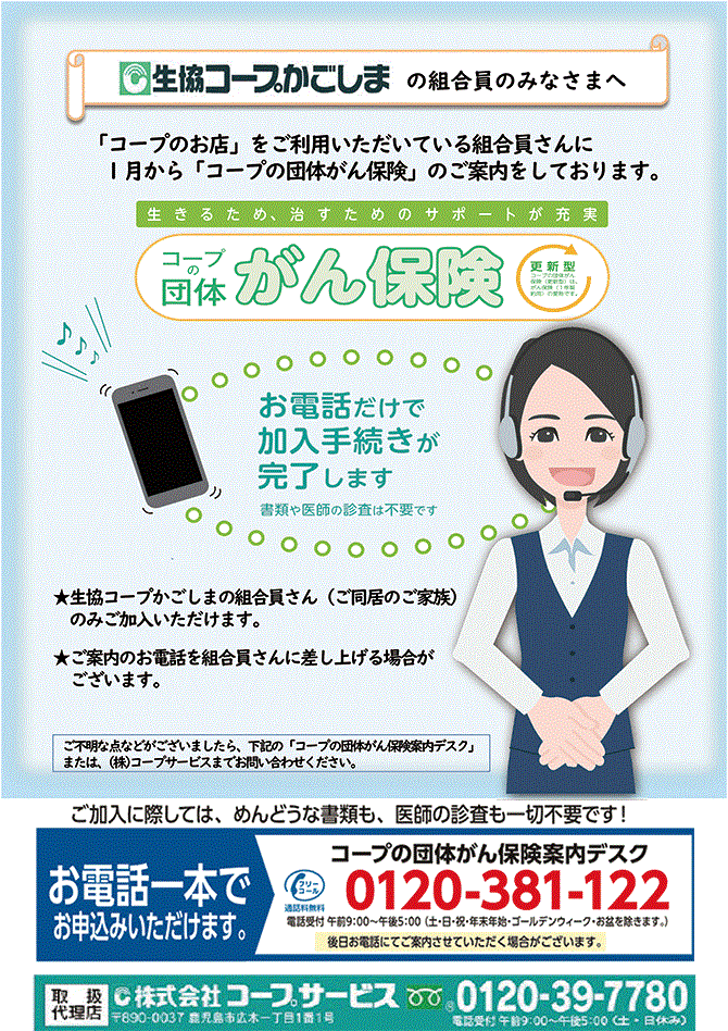 <お問い合わせ>■保険事業0120-39-7780(099-286-1139)受付時間:9時~17時 土・日休み ■利用事業0120-502-117(099-286-1138)受付時間:9時~17時 土・日休み