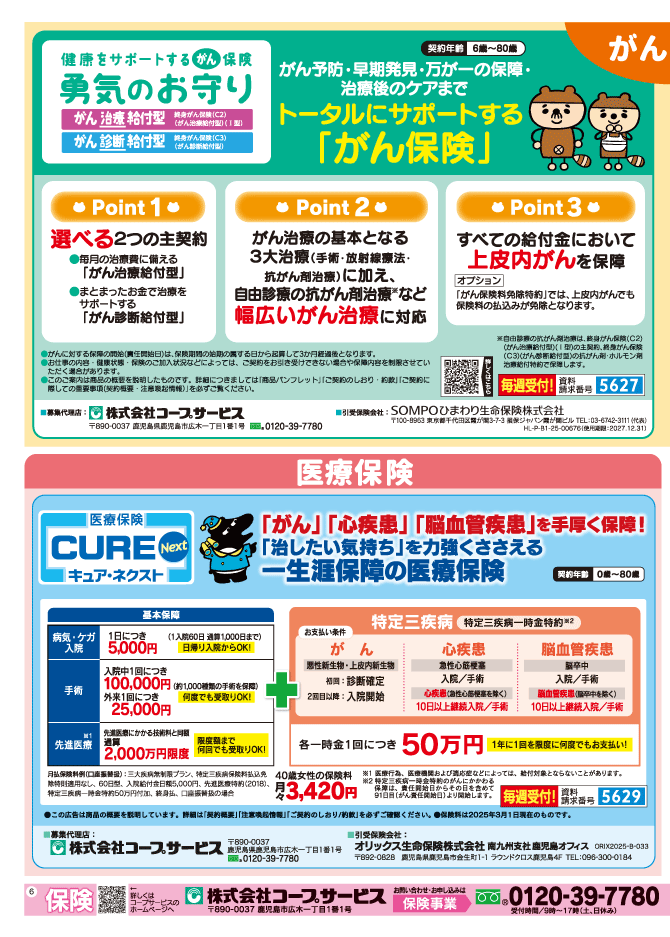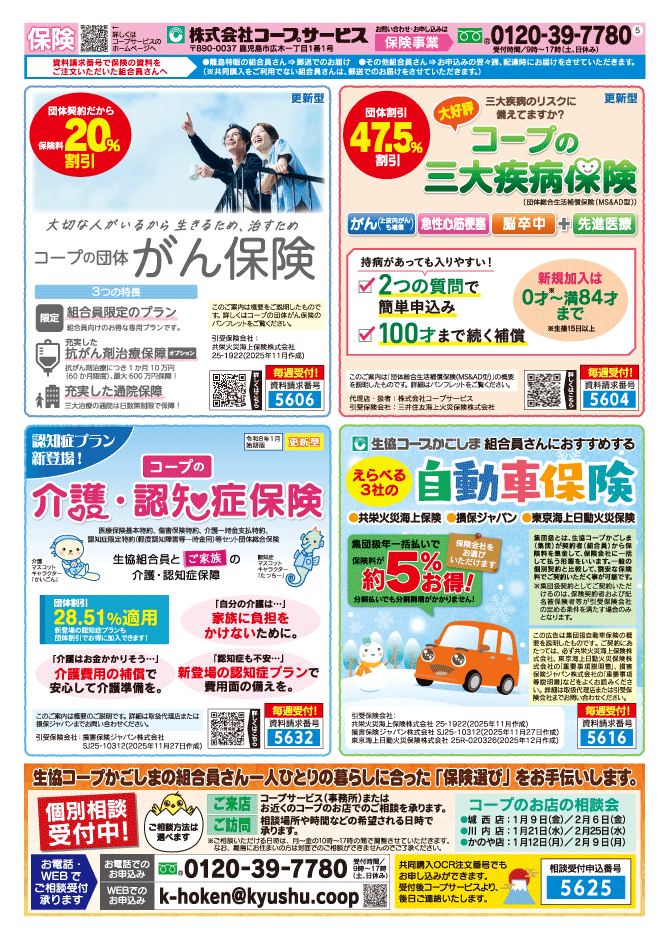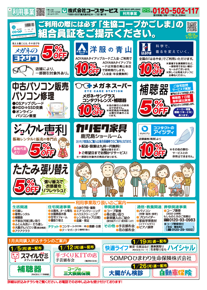 《1月号》 生活情報誌「すまいる」では、保険・利用の各事業のお知らせを掲載しています。 共同購入利用の組合員さんへは、配達カタログと共に月1回、配布しております。また、コープの各店舗にも配布しております。ご希望の方は、各店舗のカウンターにお問い合わせください。 すまいる