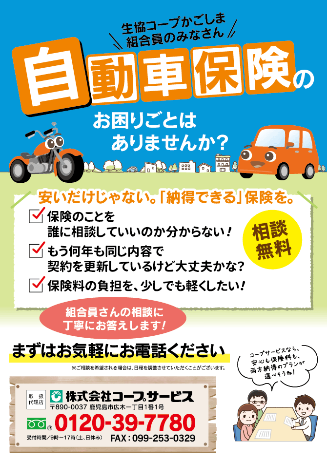 <お問い合わせ>■保険事業0120-39-7780(099-286-1139)受付時間:9時~17時 土・日休み ■利用事業0120-502-117(099-286-1138)受付時間:9時~17時 土・日休み