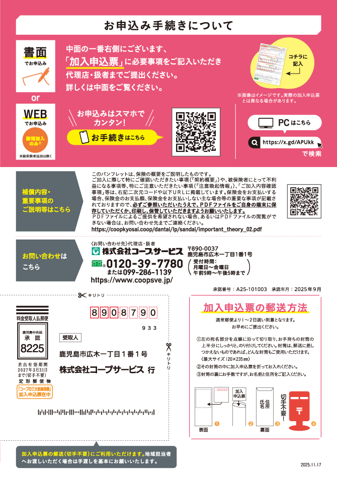 <お問い合わせ>■保険事業0120-39-7780(099-286-1139)受付時間:9時~17時 土・日休み ■利用事業0120-502-117(099-286-1138)受付時間:9時~17時 土・日休み